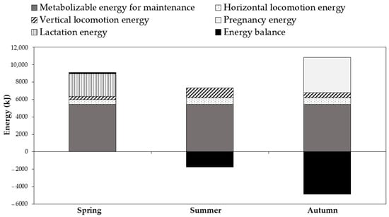 Figure 4 shows the estimation of the seasonal energy requirements and the energy balance of grazing goats. Energy requirements were significantly affected by the season (p < 0.01). The highest ME intake was recorded during spring (9086 kJ/day), in contrast to summer (5566 kJ/day) and autumn (5978 kJ/day). The energy expenditure for horizontal locomotion was higher and similar during summer and autumn (about 750 kJ/day) than in spring (565 kJ/day). The low energy expenditure for vertical locomotion was observed in the green season (359 kJ/day). The pregnancy ME requirements were estimated to be 4076 kJ/day in autumn. The additional requirement energy for lactation during spring was estimated at 2531 kJ/day. Consequently, a low surplus of energy, under these grazing conditions, was recorded during the green season (<2%), conversely to the summer and autumn seasons, which recorded a high energy balance deficit of 24 and 45%, respectively.