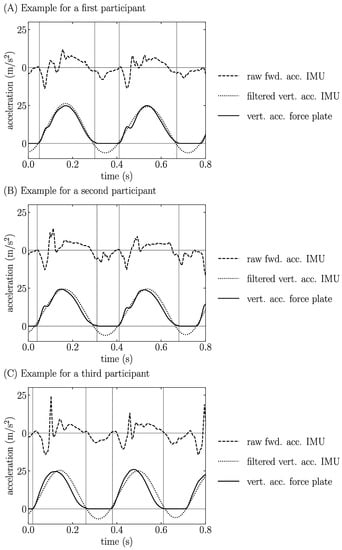 The raw forward acceleration recorded by the IMU and the filtered vertical acceleration recorded by the IMU, as well as the vertical acceleration recorded by the force plate during a running stride for three representative participants running at 11 km/h, are depicted in Figure 1.