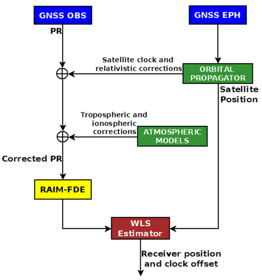 In Figure 1, a scheme describing the SPP algorithm is shown. In the scheme, a RAIM-FDE (Fault Detection and Exclusion) block is included too. The main inputs of SPP are the GNSS observables, in particular, the pseudoranges, and the GNSS ephemerides, from the navigation message. A suitable algorithm (in the “orbital propagator” block) computes the satellite positions and clock errors at the transmission epochs. The measured pseudoranges are corrected for the atmospheric, relativistic, satellite clock errors and are processed by the WLS estimator to obtain receiver position and clock error. The RAIM-FDE block detects and rejects the anomalous measurements.