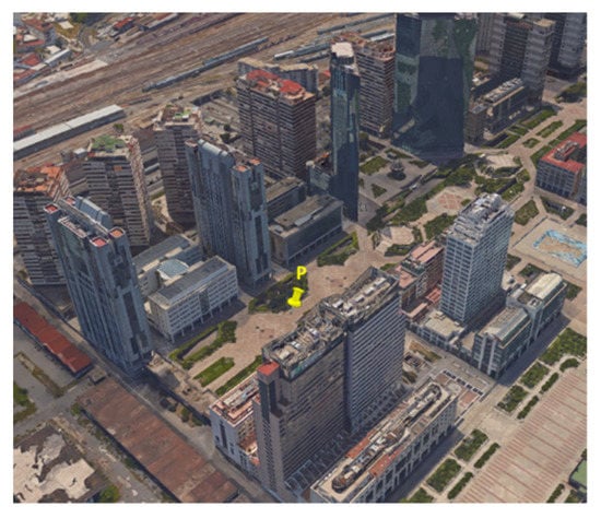 In order to pursue the goal of the work, a data collection was carried out in an urban scenario; the location of the test was the district “Centro Direzionale” in Naples (Italy), characterized by several skyscrapers which block and reflect GNSS signals. The considered devices were a smartphone Xiaomi Mi8 and an NVS receiver NV08C-CSM. The scenario of the test is shown in Figure 2; the devices were placed in point P in the figure.