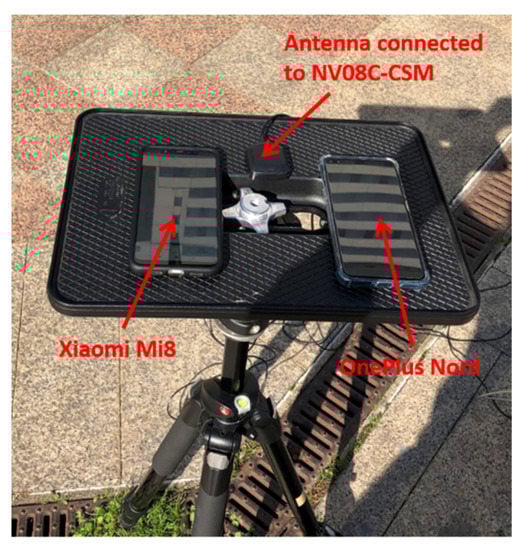 The considered devices were put on a small platform, placed at a known position, whose coordinates were determined with mm accuracy by topographical techniques. In Figure 3, the platform is shown. The antenna connected to the NVS receiver and the smartphone Xiaomi Mi8 were placed only few cm apart. Another smartphone, the OnePlus Nord, was placed on the same platform and was used to collect GNSS measurements; unfortunately, the raw measurements from the OnePlus device demonstrated an anomalous behavior and were unusable for positioning. For this reason, the results from OnePlus Nord are not discussed in this paper.