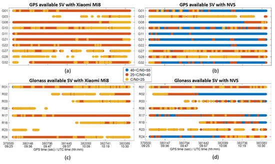 Available satellites and C/N0. Frame (a) refers to GPS satellites available from Xiaomi Mi8. Frame (b) refers to GPS satellites available from NVS. Frame (c) refers to Glonass satellites available from Xiaomi Mi8. Frame (d) refers to Glonass satellites available from NVS.