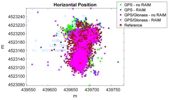 It should be highlighted that the application of the RAIM algorithm on Mi8 measurements is effective; indeed, as shown in Table 4 and Table 5, there was a significant improvement in positioning performance when RAIM functionality was active. For GPS-only, the RMS horizontal and vertical errors decreased by about 35% and 37%, respectively, with RAIM. For GPS/Glonass, the RMS horizontal and vertical errors decreased by about 47% and 52%, respectively, with RAIM. On the other hand, there were no significant improvements for Glonass-only, because the redundancy necessary for RAIM applicability was very rare during the session. The benefits of RAIM application on Mi8 measurements are also evident in Figure 5, where the horizontal positions obtained with GPS and GPS/Glonass measurements are shown. The green and blue dots represent GPS-only positions with and without RAIM, while the brown and magenta dots represent GPS/Glonass positions with and without RAIM. It is clear that when RAIM was active, the positions were more concentrated around the ground truth, indicated with a red cross in the Figure. Similar conclusions can be drawn from Figure 6, where the vertical solutions for the same configurations are shown, and the same color convention is adopted.