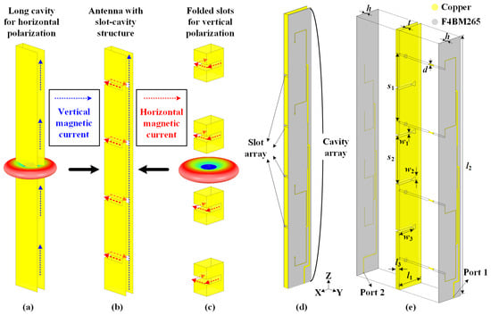 Figure 2 illustrates the evolution process of the proposed slot-cavity antenna with a ruler-like structure for HGODP radiation. The structure of the horizontal-polarized cavity is depicted in Figure 2a. When the long cavity is excited uniformly, a series of equivalent vertical magnetic currents are realized, providing high-gain omnidirectional radiation for horizontal polarization. For vertical polarization, a group of folded slots is directly carved onto the column sidewalls, as shown in Figure 2c. When the slots operate at their half-wavelength mode, several horizontal magnetic currents are equivalently obtained along the slots, causing omnidirectional vertical-polarized radiation. Based on the dual single-polarized antennas, a slot-cavity antenna is integrated within a ruler-like profile, as shown in Figure 2b. The realized horizontal and vertical magnetic currents are perpendicular with each other, leading to the orthogonal operating modes of dual polarizations. Ultimately, the proposed antenna achieves HGODP radiation and high port isolation within such a compact volume. It is worth mentioning that a configuration with a longer cavity and more slots can satisfy the requirements of higher-gain characteristics. Hence, this extendable integration method exhibits promising potentials in wireless sensor networks.
