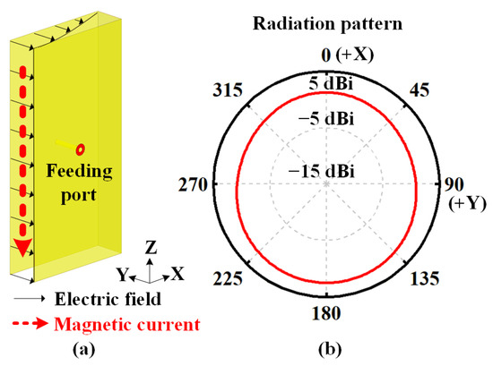 Figure 3 shows a short cavity with a height of a half wavelength for horizontal polarization. This cavity has only three metallic sidewalls. By tuning the position of the metal feeding probe, the thin cavity operates at the TE0.5,0,0 mode (the electric field is within the distribution of a quarter wavelength along the X-axis but is uniform along the Y-axis and Z-axis). The equivalent magnetic current causes the omnidirectional radiation pattern in the azimuthal plane, as illustrated in Figure 3b.