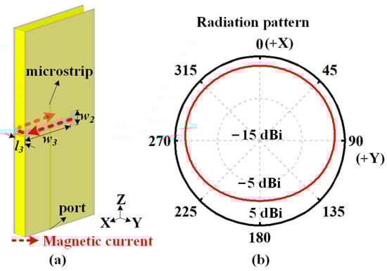 Figure 5 illustrates the configuration of the one slot for vertical polarization. A folded slot is carved into the middle of the thin cavity with a height of a half wavelength. Two dielectric substrates are attached onto the cavity sidewalls, and a microstrip line is properly fabricated onto one substrate as the feeding structure. The total length of the slot is l3 + w3 × 2 + w2 = 46.4 mm, which is nearly a half of the resonant wavelength at the center frequency of 2.44 GHz. By tuning the position and length of the microstrip line, the slot element operates at the first-order mode, causing an equivalent magnetic current along the slot and an omnidirectional radiation pattern, as shown in Figure 5b.