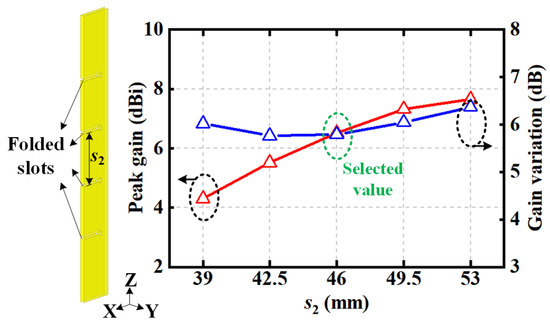 For vertical polarization, four identically folded slots with spacing s2 are uni-formly excited and directly carved onto the cavity sidewalls, as depicted in Figure 6. The radiation properties with different values of s2 are also illustrated, including the peak realized gains and gain variations in the azimuthal plane. As spacing s2 increases, the peak gain becomes larger with a narrower main beam in the elevated plane. Due to the mutual coupling between the slots, an obvious gain variation is realized in the azimuthal plane. When the space between adjacent slots is selected as s2 = 46 mm, the active impedance match is achieved and the energy is uniformly quartered on these four slots, causing a gain variation of less than 6 dB, which is acceptable for practical applications.
