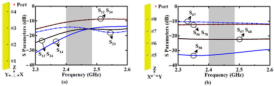 By integrating the long cavity and group of slots, the proposed dual-polarized antenna is built with a ruler-like profile. To excite this HGODP antenna, two compact feeding networks are designed and arranged onto the sidewalls of the cavity. Before the detailed design of the feeding networks, the mutual coupling between the feeding ports is analyzed for each polarization. Figure 7a illustrates the mutual coupling between the horizontally polarized feeding ports #1–#4. As seen, the isolations between adjacent ports, such as S12 and S34, are lower than 12 dB. Here, SMN represents the ratio of the energy received from Port M to the energy fed through port N when energy is fed through port N. Figure 7b shows the mutual coupling between the vertically polarized feeding ports #5–#8. It is obvious that the isolation between adjacent ports is lower than 13 dB. Therefore, when designing the feeding networks for dual polarizations, the active impedance match of each port is carried out with consideration for the mutual coupling. Finally, there is a port isolation higher than 33 dB between dual polarizations in the desired band.