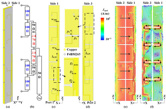 As shown in Figure 8a, two feeding networks are fabricated on the substrates and located on Sides 1 and 3 of the cavity. Figure 8b shows the topological diagram of two feeding networks for each polarization. Due to the requirement for compact size, two quarter-wavelength impedance converters are adopted. The width of the 100 Ω-microstrip is w100 accepted for the printed circuit board (PCB) process. The feeding networks for two polarizations have a similar design strategy. The detailed views of the two feeding networks are shown in Figure 8c,d, respectively. To achieve a compact size, the folded slots are adjusted into a T-shape. By tuning the position p1 of the probe, the 100 Ω-microstrip causes the impedance to match horizontal polarization. For the same purpose, the impedance for vertical polarization is matched by tuning the values of p2 and p3. The detailed dimensions are as follows: w50 = 1.33 mm, w70 = 0.73 mm, w100 = 0.34 mm, l0.25 = 21 mm, p1 = 7.8 mm, p2 = 6.5 mm, p3 = 10.16 mm, g1 = 1 mm, g2 = 1 mm, and g3 = 1 mm.