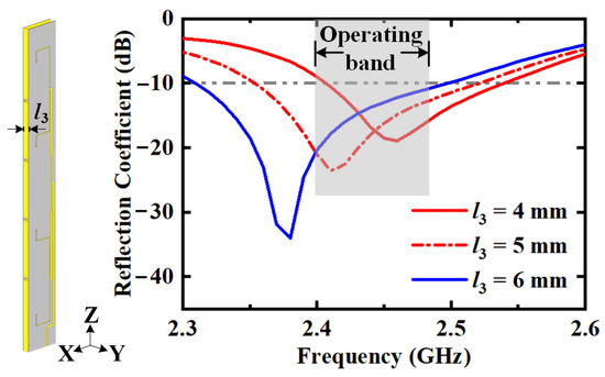 The operating bandwidth of horizontal polarization can be enhanced by increasing the cavity thickness l3. The reflection coefficients with different values of the cavity thickness l3 are depicted in Figure 9. As the cavity is thickened, the area of the radiating aperture becomes larger, reducing the quality factor of the cavity and broadening the bandwidth. Considering the trade-off between the volume of the antenna and the bandwidth of horizontal polarization, the value of cavity thickness is chosen as l3 = 5 mm in the proposed design. Similarly, the vertically polarized bandwidth can be enhanced by increasing the radiating aperture area, i.e., the slot width.