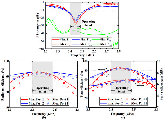 The measured and simulated S-parameters of the proposed antenna are illustrated in Figure 11a. The −10-dB impedance bandwidth is 2.37~2.54 GHz. The measured result of the port isolation is higher than 33 dB, indicating that a high isolation is achieved in the compact ruler-like structure. The discrepancies between the measurement and simulation are mainly attributed to fabrication errors. Figure 11b shows that the radiation efficiency of the proposed antenna is higher than 82% for each polarization. Figure 11c gives the peak realized gains and total antenna efficiencies. The proposed HGODP antenna achieves total efficiencies higher than 83% and 84% for the dual polarizations. On the other hand, peak realized gains of 6.7 dBi and 6.5 dBi are realized in the operating frequency band for the horizontal and vertical polarizations, respectively.