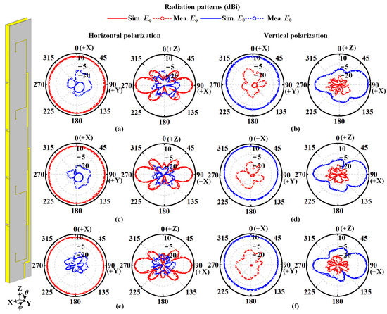 Figure 12 illustrates the radiation patterns of the proposed antenna in the operating frequency band in simulation and measurement. As seen, the measured co-polarized gain variation of 2.2 dB is achieved for horizontal polarization, and the cross-polarization level is lower than −15 dB. For vertically polarized radiation, the proposed antenna realizes a co-polarized gain variation of 5.9 dB and cross-polarization of −14 dB in measurement. The measured radiation patterns in the XOZ plane also agree with the simulated ones. In addition, the measured and simulated radiation patterns at 2.40 and 2.48 GHz indicate that stable omnidirectional radiation are obtained in the operating frequency band.