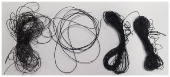 Extruded carbon-SBS fibers were highly elastic, which allowed for their storage in coils. Composites containing carbon nanotubes are matte black in color, while graphite/SBS fibers exhibit a gray appearance with metallic gloss (Figure 1).