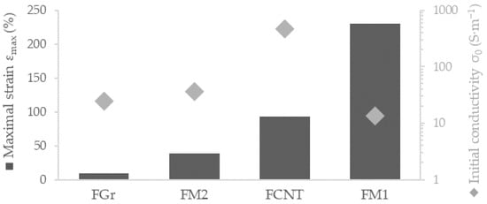 Breaking strain for different carbon/SBS composite 0.5 mm fibers with the assessment of the conductivity of the unstrained fiber. FGr is Gr/SBS filament; FCNT is CNT/SBS composition; and FM1 and FM2 are mixes of SBS, graphite, and CNT in different ratios.