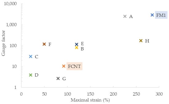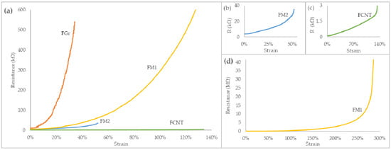 where is the initial, unstrained length of the specimen, its initial resistivity; is the total length of the strained composite, with as its measured resistivity. For fibers FGr, FCNT, FM1, and FM2, the gauge factor was calculated in various strain ranges, as presented in Table 2.
