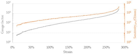where is the resistance of the fiber under given strain , is the resistance measured at a 10 percentage points lower strain and length of the specimen, and is an equivalent of 10% initial gauge length. A substantial increase in the and the gauge factor in relation to strain was observed (Figure 4), which is consistent with other reports of piezoresistive composite materials.