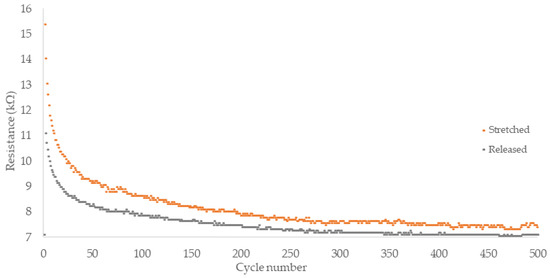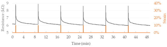 Noticeable sensitivity increase is observed in higher working ranges. For elongation between 0% and 10%, FM1 composite exhibits sensitivity of 2.7 kΩ/mm and the value increases to 24.4 MΩ/mm within 275–285%. Similarly, gauge factor increases from 5 at 10% to 2955 at 285%. The strain sensor in wearable textile application undergoes repeatable straining over movements of the body. To evaluate piezoresistive behavior under recurrent straining, cyclic testing of FM1 filament was conducted. Fibers of an initial length of 10 mm were strained by 10% at a speed of 0.5 mm·s−1 followed by an immediate return to the starting position at an equal pace. Multiple initial strains exhibited significantly higher resistance response than subsequent cycles; hence cycles 12–17 were chosen to represent the fiber’s performance under repetitive loading (Figure 5). A period of 1s of stretching and 1s of unstraining was followed by 8 min of rest time to ensure a return close to the baseline resistance—the extended idle time allowed to observe repeatability and dynamics of resistivity decrease after releasing the fiber.
