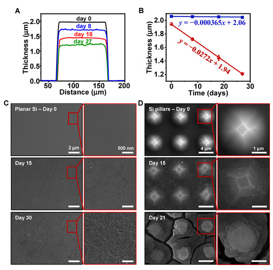 (A) Line scan profiles for planar Si immersed in DMEM at different stages. (B) Measured changes in thickness as a function of immersion time for planar Si samples in DMEM (red) and PBS (blue) solutions. (C,D) Top-view SEM images of surfaces for (C) planar Si and (D) Si pillars immersed in DMEM at different stages.