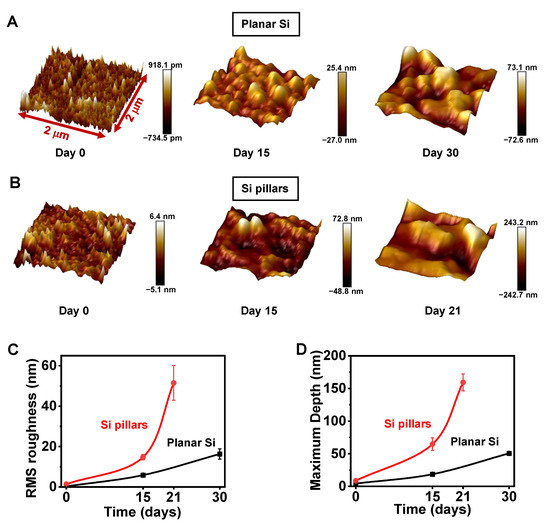 (A,B) Three-dimensional AFM images showing the surface morphologies of (A) planar Si and (B) Si pillars during degradation in DMEM. (C,D) Summarized (C) RMS roughness and (D) profile depth based on AFM images.