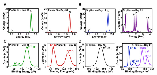 Characterization of surface chemistry associated with degradation in DMEM for different Si samples. (A,B) EDS data for (A) planar Si and (B) Si pillars. (C,D) XPS data for (C) planar Si and (D) Si pillars.