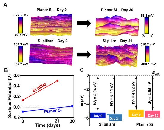It is known that semiconductor surface states or surface potentials play an important role in Si electronics. The electronic and optical properties of semiconductor homojunctions and heterojunctions can be controlled by altering the energy band alignment and carrier distributions at the junction interface [30]. In physiological environments, Si-based implantable devices may also establish functional interfaces with biological molecules, cells, tissues, and organs, and offer localized biophysical cues to the biosystems [1]. Therefore, understanding surface electronic states is crucial for Si-based transient implants at the biointerfaces. For instance, the energy band positions relative to the solution redox potentials determine the electrochemical or photoelectrochemical reactions at the Si–solution interface. KPFM is a powerful tool to measure the semiconductor work function (Wf; energy difference between the Fermi energy and the vacuum level) by recording the contact potential difference (CPD) between the probe and the sample surface [31]. In order to investigate the changes in surface states, we performed KPFM on the surfaces of Si samples (scanning area 2 × 2 µm2) before and after degradation in DMEM. Figure 4A maps the CPD distributions (calibrated with a standard Au film sample with Wf = 5.2 eV), and all of the samples yielded growing surface potentials (with mean values extracted from Figure 4A), with ΔV = 101.7 mV for the planar Si film and ΔV = 365.1 mV for the Si pillar arrays (Figure 4B). The corresponding work functions are calculated and summarized in Figure 4C. In this comparative study, one can see that the work functions for both Si samples slightly increased over the course of degradation process. The work function of the corroded planar Si sample (at day 30) remained larger than that of the original Si pillar sample (at day 0); this result is probably attributable to the surface contamination and/or oxidation occurring during the dissolution process. It is also known that the doping condition affects the state of the Si as well as its degradation rate [25,26]. Combining the surface chemical and physical analysis, our results indicate that the degradation causes dramatic changes of surface states and alters the energy band or electrical properties at the biointerface, and will eventually affect the operational performance of the implantable Si devices.