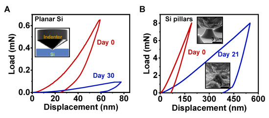 Experimentally measured load–displacement curves for (A) planar Si and (B) Si pillars before (red) and after (blue) degradation in DMEM. Inset in (A): scheme for test setup. Insets in (B): SEM images showing the indenter on Si pillars.