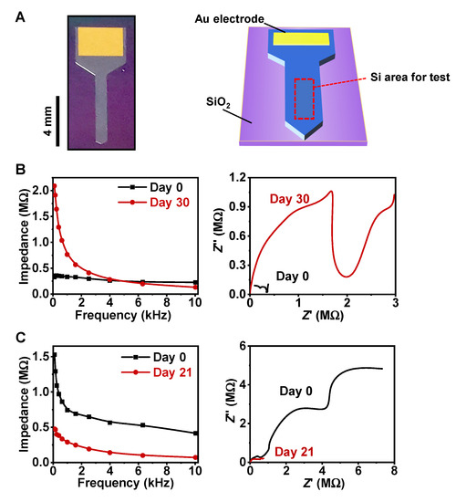 The chemical and structural evolutions of these Si samples also induce changes in electrochemical properties at the Si–solution interface [34]. We prepared needle-shaped Si probes similar to Michigan electrodes, as shown in Figure 6A. The front area of the Si probes was designed and fabricated to form planar or pillar arrays. Immersed in PBS at room temperature, the electrochemical impedance was measured with a three-electrode configuration. Figure 6B,C present the measured impedance results (left: Bode spectra; right: Nyquist spectra) for planar Si and Si pillars, respectively. The charge-transfer resistance can be estimated from the semicircle region of the Nyquist plots, which is related to the electrochemical activity at the Si–solution interfaces. Based on the Nyquist spectra, after 30-day immersion in DMEM, the planar Si sample achieved higher charge-transfer resistance, indicating lower conductivity with poor transport of charge carriers. In contrast, the Si pillar sample obtained lower charge-transfer resistance after 21-day immersion, showing excellent conductivity with faster transfer of charge carriers. In short, after degradation in DMEM, the planar Si sample exhibited a substantial increase in impedance, while the Si pillar sample showed dramatically reduced impedance. This striking difference in the change in impedance is probably associated with the micro/nanostructural evolution of the different samples. For planar Si, the enhanced impedance may be caused by thin insulating oxides formed on the surface. In contrast, the degradation of Si pillars causes notable crack formation (Figure 1D), which could significantly increase the surface area and decrease the interface impedance.