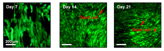 Considering the remarkable transformation of the surface topography and chemical and physical states during the degradation process, it is critical to evaluate the biocompatibility of Si pillar structures. Here, the common live/dead assay was carried out to measure cell viability and assess cytotoxicity in vitro. hBMSCs were cultured in DMEM, with fluorescent images taken on days 7, 14, and 21, as shown in Figure 7. Calcein-AM (Ex/Em, 485 nm/535 nm) and propidium iodide (Ex/Em, 530 nm/620 nm) were applied to stain live (green) and dead (red) cells, respectively. Overall, hBMSCs were successfully cultured, and proliferated significantly from 7 to 21 days in DMEM, in spite of severe degradation occurring on the surface of these Si pillar arrays. The reported biocompatibility of the Si films was consistent with the literature [23]. Although the number of dead cells (red staining) increased due to the natural apoptosis during the long-term culturing, the ratio of dead cells to live cells was still very low. In terms of the cellular morphology, cell quantity, and viability, there were no obvious toxic effects throughout the whole experimental duration, confirming that the degradation reactions that occurred at the Si–solution interface are fully biocompatible and harmless to cell metabolism.
