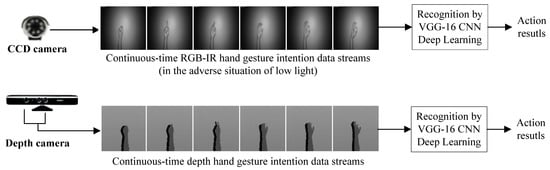 Human activity recognition [1], which belongs to the categorization of behavior cognition, has been paid much attention in recent years. Human activity information can be represented by two main biometric characteristics: body and hand gesture features. Body gesture-based human activity recognition is generally used in applications of sport instructor experts [2], human–machine interactions by gesture commands [3,4], gesture-based identity recognition [5,6] and rehabilitation tasks\healthcare assistants [7,8,9]. On the other hand, in the field of hand gesture-based human activity recognition, sign language recognition [10,11] and human intention recognition [12] can be practically constructed in real-life applications. Focusing on human activity recognition by hand gesture information, this work proposes a hand gesture-based intention recognition approach by simultaneously considering two different modalities of image data derived from both a charge-coupled device (CCD) and depth cameras.