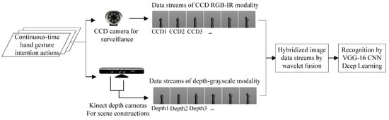 Although lots of image fusion approaches have been investigated, most of these studies mainly combine the two advantages of night-visible capability and rich texture information obtained from IR and VIS-RGB, respectively. In a CCD camera-based surveillance scenario with human activity recognition, such fusion of VIS and IR images for further hand gesture activity recognition will perhaps not be feasible. During nighttime of darkness, i.e., an environment with extremely low illumination, it will be difficult to obtain the information from VIS images. In this situation with insufficient light (darkness approaching), only the CCD RGB-IR image can be acquired from the CCD camera. However, human activity recognition using only CCD RGB-IR with the restricted texture details will not have perfect recognition performances. In some studies [20,21,22,23], thermal image-based approaches to use images of infrared thermography (IRT) acquired from the sensing device of the IR thermal imager for analyzing activity gesture information are presented to maintain a satisfactory recognition accuracy even in an adverse environment of low lights. However, a high cost problem of the IR thermal imager will be inevitably encountered, which will be an adverse factor on the market acceptance to such intelligent applications. To tackle this issue, in this paper, depth image information derived from a depth sensor that belongs to the sensor category of time of flight (ToF) is additionally considered to be fused with the CCD RGB-IR data for constructing hand gesture intention recognition with outstanding performance. It is well-known that a depth sensor will not be restricted in performance by the illumination factor. A hand gesture intention recognition system using convolution neural network (CNN) deep learning incorporated with wavelet image fusion of CCD RGB-IR and depth-grayscale data is proposed in this work, which will be detailed in the following sections.
