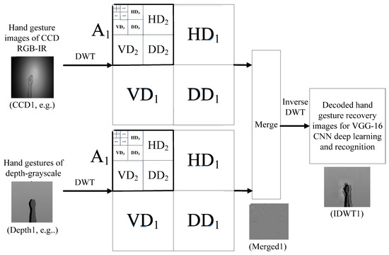 Following DWT data decomposition, a merge computation to hybridize these two different modalities of DWT coefficient parameter sets of CCD RGB-IR and depth-grayscale in each of the five levels will be done. Finally, an inverse DWT (IDWT) estimate will be performed on the merged data (i.e., data decoding), where a recovered image with pixel-based raw data can then be obtained and further used for CNN deep learning and recognition, which will be detailed in Section 3.2.