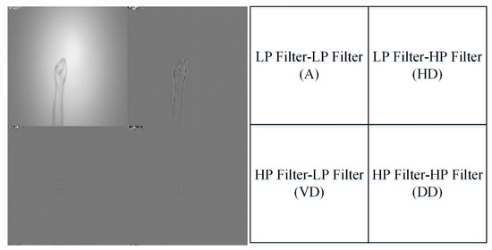 As mentioned, in the wavelet-based image fusion, each of two different sensor modality data of the acquired hand gesture intention action image is first used to derive the corresponding filter coefficients using wavelet transform. The well-known wavelet transformation of the image with two-dimensional (x,y) pixel raw data is essentially categorized into two-dimensional wavelet transformation, which performs an encoding procedure using the original input image. The discrete wavelet transform will separate the original image to four different independent segments, which are the approximated (A) image part, the horizontal detail (HD) data part, the vertical detail (VD) data and the diagonal detail (DD) data. Figure 5 shows an example that one-level DWT decomposition is performed on a hand gesture image with the sensor modality of CCD RGB-IR. It is clearly seen that four decomposed components, A, HD, VD and DD, are extracted after the one-level DWT process. Note that the approximated image part will keep most of the original image data, and it is obtained by calculations of low-pass (LP) filter and LP filter (i.e., the LL decomposition coefficient); the HD segment is derived using the LP filter and the high-pass (HP) filter (i.e., the LH decomposition coefficient); the HP filter and the LP filter are employed to determine the VD segment (i.e., the HL decomposition coefficient); finally, the DD segment can be estimated using two high-pass filters, HP filter-HP filter (i.e., the HH decomposition coefficient). These LL, LH, HL and HH wavelet decomposition coefficients that are representative of those corresponding regions, A, HD, VD and DD, respectively, can be estimated using Equations (1)–(4), as follows.