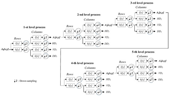 Note that in Equations (1)–(4), and denote low-pass filters, and and represent high-pass filters; the index i is the level number of iterative DWT decomposition levels. These four terms, , , and , denote the approximated image part, the vertical detail data part, the horizontal detail data part and the diagonal detail data part in the i-th level DWT decomposition, respectively. Parameters x and y are the x-axis and y-axis positions of a pixel in an input image, respectively. The maximum value of both x and y is set to − 1 ( = 224, as shown in Equations (1)–(4); images with the invariable size of 224 by 224 required for specific deep learning of VGG-16 CNN, as introduced in Section 2). In a series of multi-level DWT decomposition calculations, the approximated image part, , keeps crucial information about the pixel raw data in the i-th decomposition level, by which the DWT decomposition parameter sets of the next level (i.e., i + 1) can then be iteratively estimated. It is also noted that the term with i set to 0, i.e., , denotes the original input image before performing DWT.