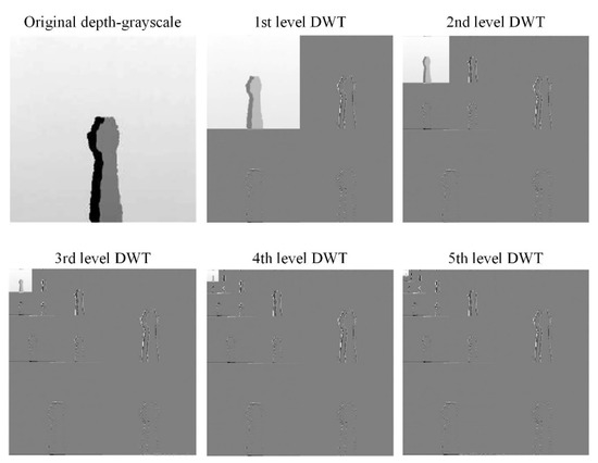 Coefficient derivation process of 5-level DWT decomposition on sensing data of the depth grayscale modality of the hand gesture action.
