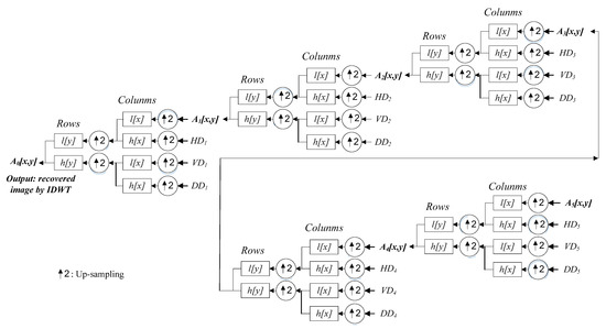 Five-level IDWT calculations employed in this work for finally obtaining the recovery images with pixel information (flowcharts of the IDWT decoding of each of the five levels).