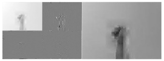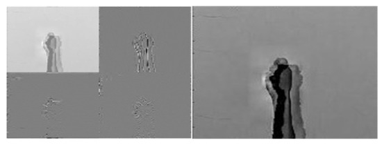 Figure 10, Figure 11 and Figure 12 depict wavelet image fusion of CCD RGB-IR and depth-grayscale by the DWT decomposition coefficient fusion strategies of max-min, min-max and mean-mean, respectively. For clearly observing the difference of each fusion strategy on the merged image and its corresponding IDWT-decoded image, only one-level wavelet image fusion information is shown. As shown in Figure 10, the left represents the max-min merged image information, i.e., the set of four segments of , , and , which are derived from the computation of , , and , respectively (see Equations (5)–(8)). The right of Figure 10 denotes the recovery image from calculations of IDWT on the max-min merged image information (i.e., one-level IDWT operations, the term estimated from Equation (17) with ). Similarly, the merged image information and the recovered pixel-based image by the corresponding IDWT decoding process of min-max and mean-mean wavelet image fusion can be seen in Figure 11 and Figure 12, respectively (also see Equations (9)–(17)). Note that, as mentioned before, such IDWT-decoded images generated from max-min, min-max or mean-mean wavelet image fusion (five-level wavelet transform calculations employed in this work (i.e., the IDWT initial setting set in Equation (17)) will then further be carried out for VGG-16 CNN deep learning and recognition.