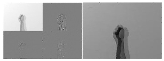 The “max-min” merge strategy performed on two 1st-level DWT coefficients derived from CCD RGB-IR and depth-grayscale hand gesture images (the left) and the IDWT-decoded recovery image of the “max-min” merged (the right) for VGG-16 CNN deep learning.