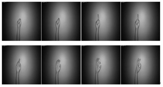 Note that these captured hand gesture actions in Table 1 belong to the type of CCD RGB-IR, captured using a CCD camera in a situation of almost complete darkness. Figure 13 reveals that the specific subject performs the indicated gesture action in a proper location to the deployed image sensor. Note that, in Figure 13, when the CCD camera operates in dark conditions, i.e., in insufficient light, the IR lights around the image lens of the CCD will keep emitting to ensure visible rendering of the RGB images (see the right of Figure 13). In total, 60,000 action images were collected, mainly including two separated parts: 30,000 action images of CCD RGB-IR and 30,000 action images of Kinect depth-grayscale; the collected subject was to make an action for each of the indicated 10 types of hand gesture intention actions, with each specific type of action performed 50 times (25 times for actions for deep learning model training and the other 25 times actions for the deep learning model test). Each gesture action is a completed image capture in the time period of 2 s with a frame rate of 30. The established database is used for action recognition performance evaluations of the presented VGG-16 CNN deep learning incorporated with wavelet image fusion of CCD RGB-IR and depth-grayscale modalities.
