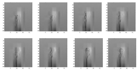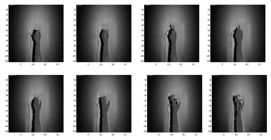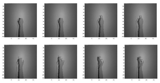 Figure 14, Figure 15, Figure 16, Figure 17 and Figure 18 show an example of the 5-level wavelet image fusion of the two different sensor modalities of hand gesture action images used in this study. For simplicity, only wavelet transform fused images of the “Action 1” type of hand gesture intention actions are provided. Figure 14 and Figure 15 are the original single modality of the image data captured from the depth sensor and the CCD camera, respectively. The merged images of “max-min”, “min-max” and “mean-mean” wavelet image fusion of the “Action 1” CCD RGB-IR and depth-grayscale images are given in Figure 16, Figure 17 and Figure 18, respectively. It is also noted that the wavelet fusion merged images are then used for training and recognition of the CNN deep learning.