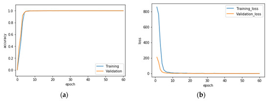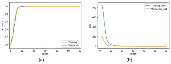 As mentioned, this work employs 5-level wavelet image fusion for hybridizing two different sensor modality data. Before VGG-16 CNN deep learning and recognition, each of the 30,000 CCD RGB-IR action images collected was made into a wavelet image fusion of “max-min”, “min-max”, and “mean-mean” with the corresponding image of the same time-stamp in another collected set of 30,000 depth-grayscale action images. In total, there are 30,000 “max-min” wavelet fused images, 30,000 “min-max” wavelet fused images and 30,000 “mean-mean” wavelet fused images for making the recognition and testing the three different VGG-16 CNN deep learning models (for each VGG-16 CNN, 15,000 action images used for model training and the other 15,000 action images used for model test). In the phase of VGG-16 CNN model training, the related hyper-parameter settings were finely made, the batch size set to 50, the learning rate set to 0.0001, the training ratio set to 0.8 and the number of epochs set to 60; in addition, for minimizing the value of the training loss, a popular optimizer, “Nesterov Momentum”, with the value of momentum set to 0.9, was also adopted in training of VGG-16 CNN. The specifications of the related hardware devices employed in the developed hand gesture intention recognition system are as follows: a desktop PC with a Windows 10 OS, equipped with an i7-8700 3.20 GHz CPU (Intel, Santa Clara, CA, USA), 16 GB RAM and a graphics card with a Geforce GTX 1080 Ti GPU (Nvidia, Santa Clara, CA, USA); a CCD camera for capturing the CCD RGB-IR hand gesture images was connected to a monitor host with four surveillance channels (only one channel used in this work). In total, 8 IR-LEDs were deployed around the central image sensor in the CCD camera. The AVI video recorded from the CCD camera has the specific format of H.265, 1920 × 1080 and 255 kbps. Note that the AVI video then performed extractions of H.265-encoded images and decoded images (RGB-IR images with specific time-stamps finally obtained for recognition system developments). The Microsoft Kinect sensor device for acquisitions of depth-grayscale images belonged to the Kinect v1 type, where the effective range for depth capturing is from 0.5 m to 4.5 m. In this work of acquiring the depth-grayscale gesture images, the distance between the gesture-making subject and the sensor device is about 1.25–1.30 m. The Kinect for Windows software development kit (SDK) v1.8 was used in this work.