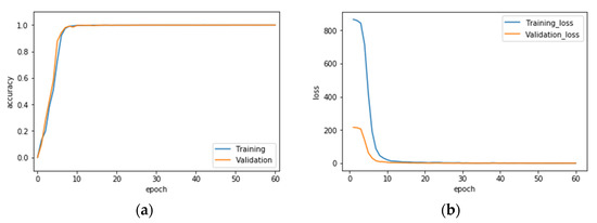 Recognition rate (a) and loss value (b) curves of the VGG-16 CNN model training using min-max wavelet fused images.
