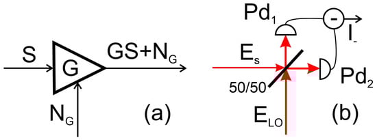 To determine receiver sensitivity, we model the receiver and the additive noise sources in the form shown in Figure 3a. The signal (S) from the antenna is going to the photonic circuit that amplifies (or attenuates) it by the gain factor G given by (18). It also adds noise defined by the Johnson–Nyquist (thermal), as well as optical (shot and intensity) noise.