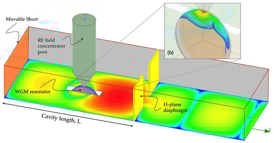 Structural model of the resonant section of the electro-optical transducer in HFSS with the WGM resonator and RF-field concentrator post. The wave-port excitation is to the right of the structure and the movable short is modeled as a PEC to the left. The H-plane diaphragm (also modeled as PEC plates) and the movable short create the waveguide cavity, parameterized by its length L. The strength of simulated E-field inside the waveguide structure is shown with the scaled colormap (red corresponding to the strongest field strength). Inset (b) shows the distribution of the simulated field inside the resonator.