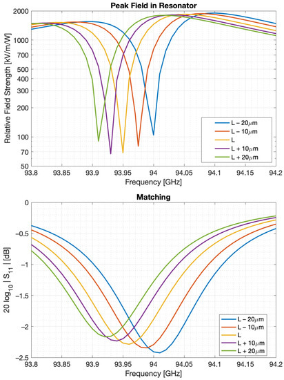 Figure 5 shows the peak relative field strength, 2 m inside the WGM resonator as a function of RF frequency centered around 94.05 GHz. Field strength is displayed in units of kV/m relative to an excitation power of 1W. The fields are plotted at a depth of 2 m below the resonator rim since the optical radial window function peaks at that depth, thus most directly impacting the electro-optic coupling rate, g and the photonic gain G. Figure 5 also shows the sensitivity of the peak field to the length of the resonant cavity, L, which is equivalent to moving the shorting stub relative to its nominal position. This allows us the ability to tune the cavity length, L, and overcome fabrication tolerances. The nominal structure is designed to have a relative field strength peak of approximately 2000 kV/m/W at 94.05 GHz. In addition, shown in Figure 5 is the matching, or , of the resonant structure. As evident from Section 3 and Section 4, matching itself does not directly impact receiver performance; however, observed variation in is useful as a stand-in for field strength, allowing us to tune the resonant structure using W-band measurements alone and not require optical measurement infrastructure during preliminary testing.