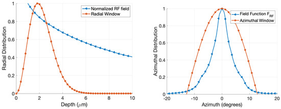 Simulated RF field strength and the radial window function vs. the depth (left). Simulated normalized RF field strength evaluated at the optical WGM depth m, and the azimuthal window function (right).