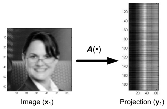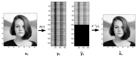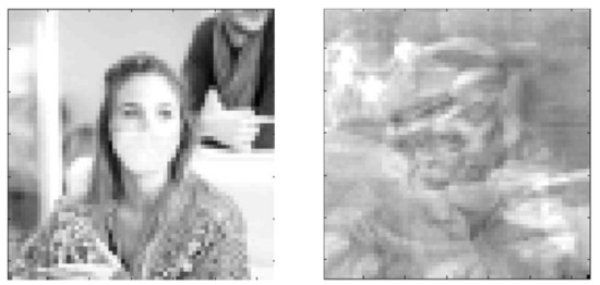 In the system presented in Figure 13, the distorted projections of the images undergo reconstruction, in contrast with the system in Figure 7, where the distorted images are reconstructed. To illustrate the properties of the reconstruction system presented in Figure 13, a training set S was generated using Equation (26) consisting of nine images where were images from Figure 3, and their projections were obtained with the random matrix . An exemplary transformation of Image Number 9 from Figure 3 is shown in Figure 14.