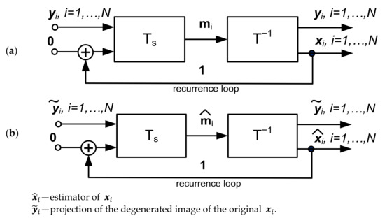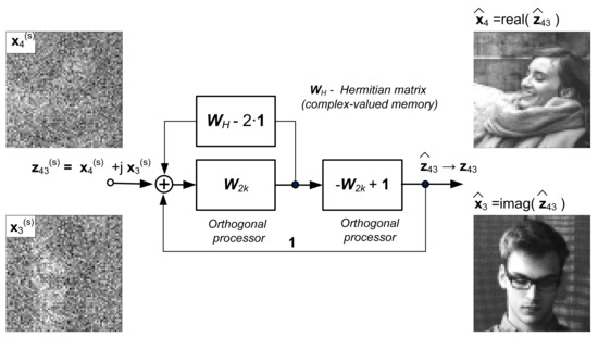 To conclude, Figure 1, Figure 7, and Figure 11 show image reconstruction systems that substantially implement an associative memory structure for recognizing damaged key patterns. However, it is worth noting that on other hand, the system in Figure 13 implements inverse transformation and solves optimization tasks constrained by images stored in memory. Moreover, this system enables the solving of linear Equation (23) by using a random form of training vectors in Equation (26) [1] as well.