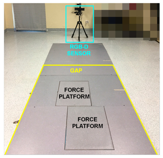 Then, a gait analysis path (GAP) was defined inside the walkway to ensure the total body tracking with the necessary accuracy: the start line was 4.2 m away from the sensor’s position, while the end line was about 1.5 m away. This setup seemed to limit the analysis to a restricted area of the walkway, which was, in any case, sufficient to capture at least one complete gait cycle (or full stride) for each leg based on the motor conditions of the participants [57]. Moreover, GAP was adequate to guarantee the maximum depth accuracy on which the body-tracking accuracy and robustness also depend: according to [78], the vertical and lateral scattering of light pulses affect the depth accuracy in the working volume. The greater precision was along the central visual cone of the RGB-D system, where the depth accuracy was less than 2 mm, increasing to 4 mm up to 3.5 m and over 4 mm beyond 4.0 m from the sensor. It was also necessary to consider that the GAP was set approximately across the walkway mid-zone and around the force platforms, thus enabling the simultaneous gait analysis using the 3D-GA system. Figure 1 shows the experimental setup. Particular attention was paid to avoiding the presence, on the scene, of reflective surfaces and light sources entering the RGB-D sensor: these elements could interfere with the light pulses emitted by the device, generating artifacts in the depth map and, consequently, errors in the detection of the body map and the reconstruction of the 3D skeletal model. These measures can become constraints, especially for domestic environments. In this scenario, further constraints concerned clothing: in particular, baggy and too dark clothing and reflective objects needed to be avoided as they could interfere with the accurate motion capture. All these requirements will be part of the domestic experimental protocol, and all participants will have to be trained and supported in the system’s configuration.