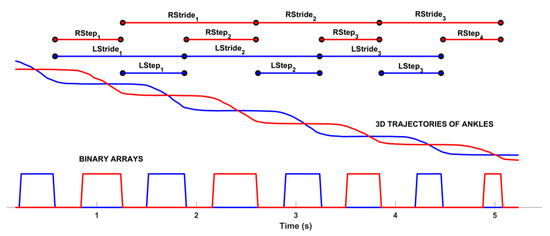 The second phase relied on a custom-written step segmentation algorithm explicitly designed to identify each step when the subject was inside the GAP zone. The step segmentation algorithm worked on the 3D trajectories of the ankle joints to avoid the loss of accuracy of foot joints [80]. When the subject entered the sensor’s field of view, the body-tracking algorithm started to provide the skeletal model. However, for the gait analysis with RGB-D system, it was essential to detect the time when the subject entered and left the GAP zone to identify the time window to be analyzed. To this end, the algorithm firstly estimated the 3D body center of mass (COMBODY) as in [51] and then used its 3D Euclidean distance from the sensor to determine the time when the subject entered and left the GAP, as in [72]. After identifying the time window, the step segmentation algorithm used the 3D trajectories of left (ANKL) and right (ANKR) ankles to analyze each leg individually inside the GAP and estimate the related gait parameters. In particular, the z-component of the 3D joint was used to apply a binary thresholding in order to identify the “stationary” and “in movement” ankle periods. The stationary ankle period was when the difference between two consecutive z-component values was less than the prefixed threshold; the “in movement” ankle period was when the difference was over the prefixed threshold. As in [72], the threshold was 2 cm: the aim was to verify that the threshold defined for post-stroke subjects was also valid for PD subjects and that the step segmentation algorithm worked exactly the same way without tuning parameters. The results of the step segmentation algorithm were two binary arrays that allowed the extraction of some traditional gait parameters per leg and overall, as in other reference studies using RGB-D approaches [37,46,56,61,66]. Figure 2 shows an example of the sequence of steps and some temporal parameters estimated from the binary arrays.