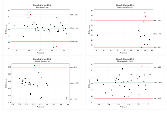 In Figure 3, the Bland–Altman plot is displayed. It is a scatterplot of the mean of the RGB-D system and instrumented 3D-GA method plotted against the difference between the two methods [86]. It is possible to observe that the Bland–Altman graphs globally display a good agreement between the two measurement systems as most of the points fell within the interval.